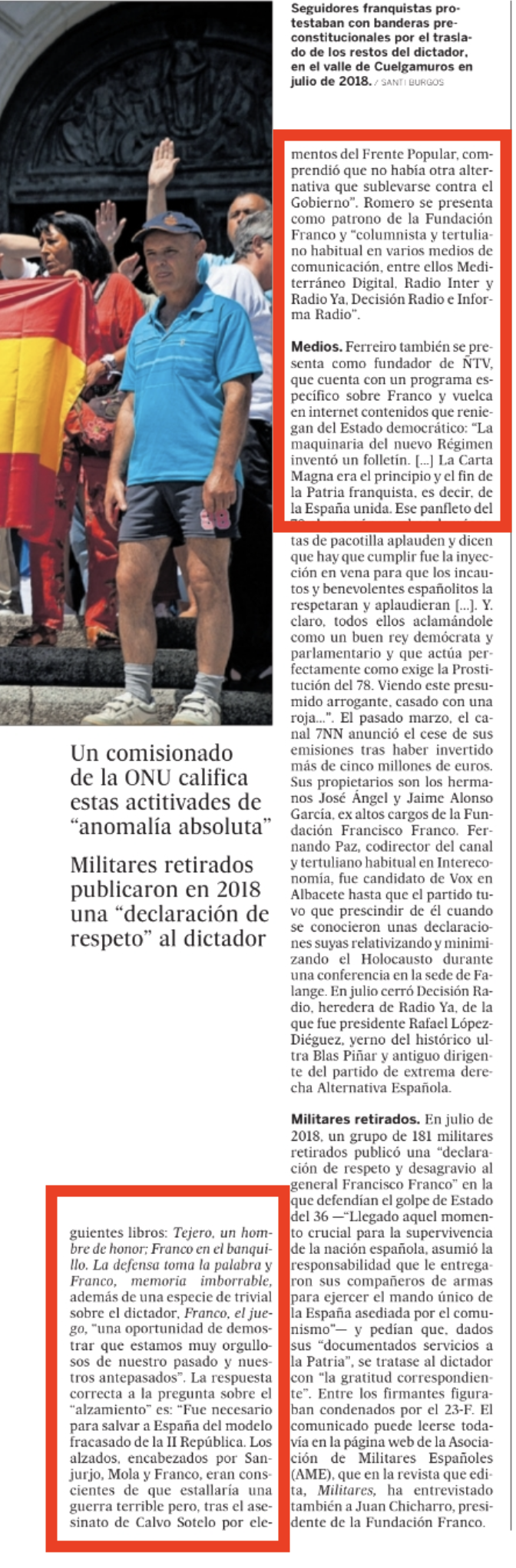 Ferreiro también se presenta como fundador de ÑTV, que cuenta con un programa específico sobre Franco y vuelca en internet contenidos que reniegan del Estado democrático: “La maquinaria del nuevo Régimen inventó un folletín (…) La Carta Magna era el principio y el fin de la Patria franquista, es decir, de la España unida. Ese panfleto del 78 al que aún muchos demócratas de pacotilla aplauden y dicen que hay que cumplir fue la inyección en vena para que los incautos y benevolentes españolitos la respetaran y aplaudieran (…) Y claro, todos ellos aclamándole como un buen rey demócrata y parlamentario y que actúa perfectamente como exige la Prostitución del 78. Viendo este presumido arrogante, casado con una roja…”.
