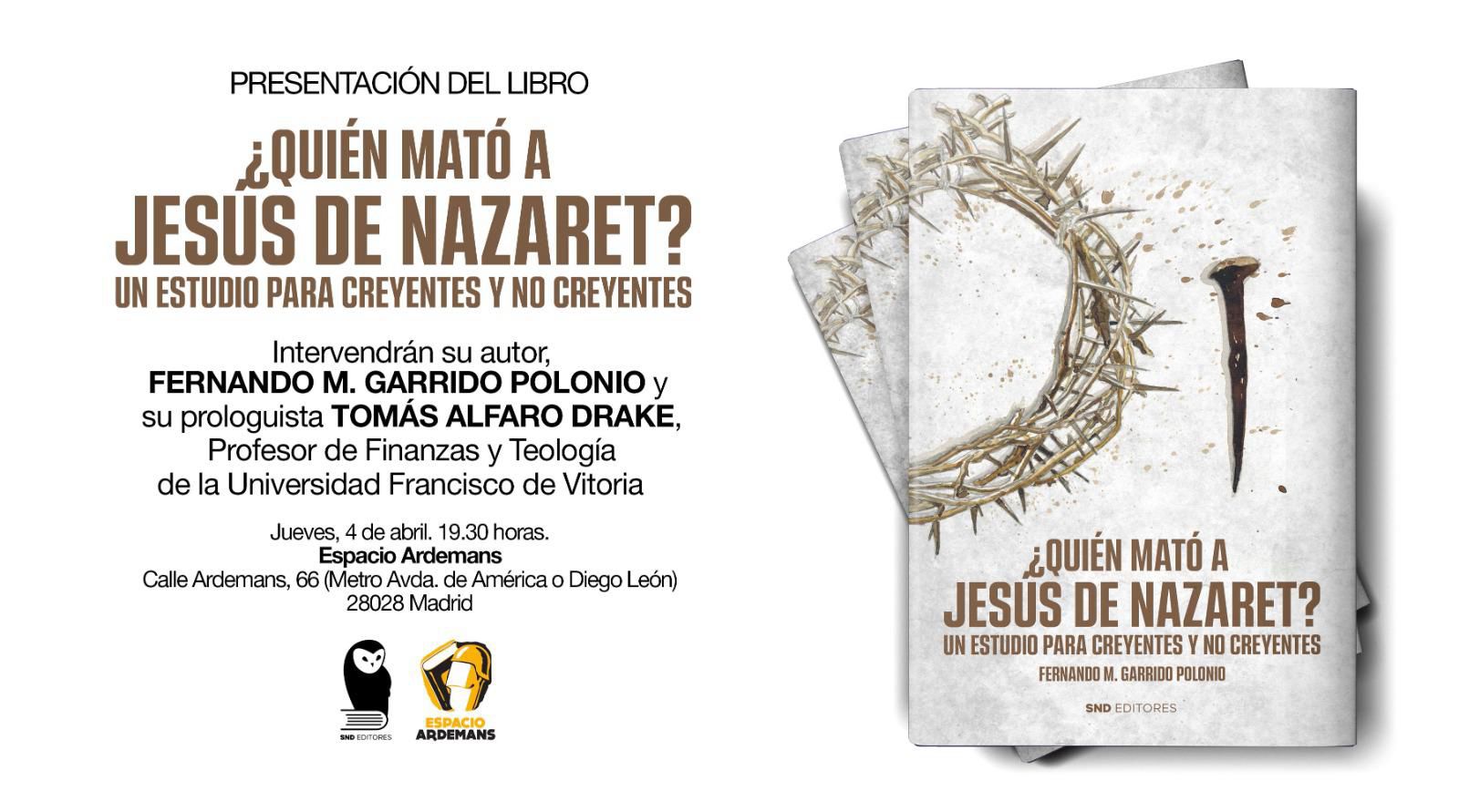 Jueves 4 Abril. 19:30 h. Presentación de “¿Quién mató a Jesús de Nazaret?” por su autor Fernando M. Garrido Polonio, con la intervención del prologuista Tomás Alfaro Drake.