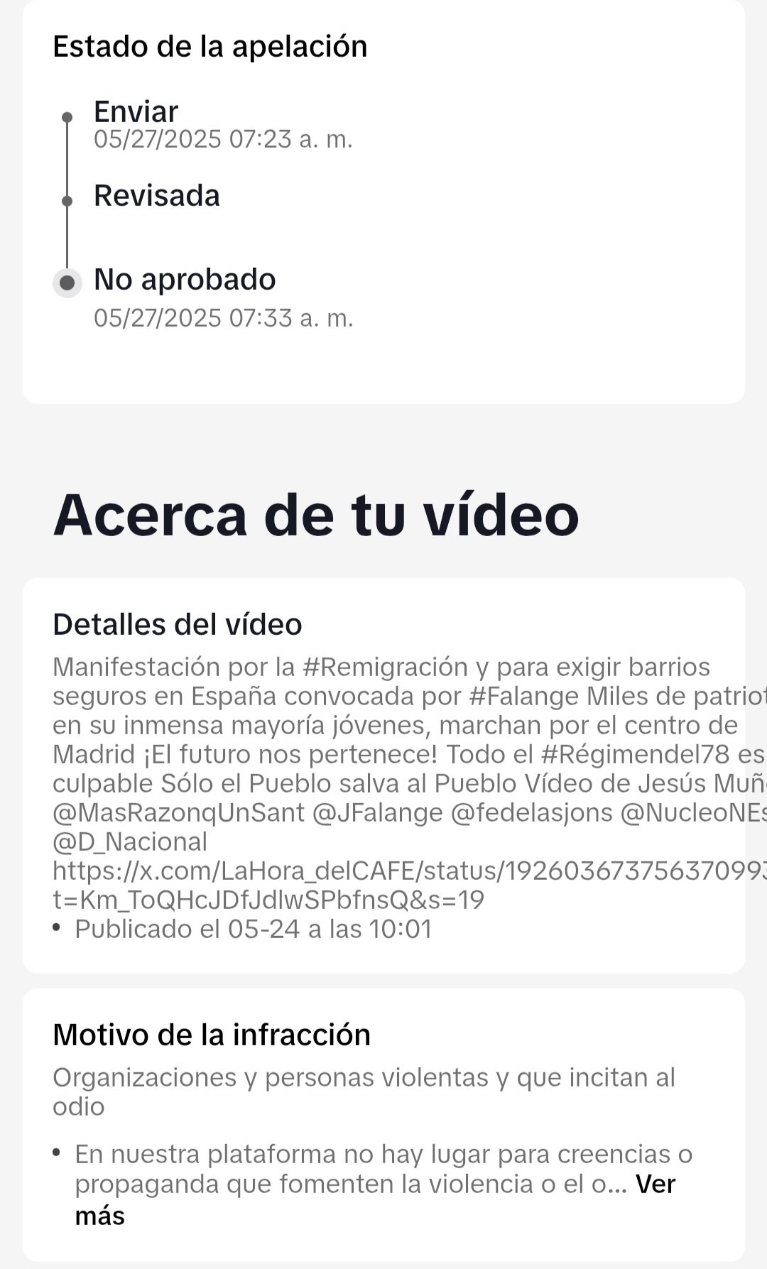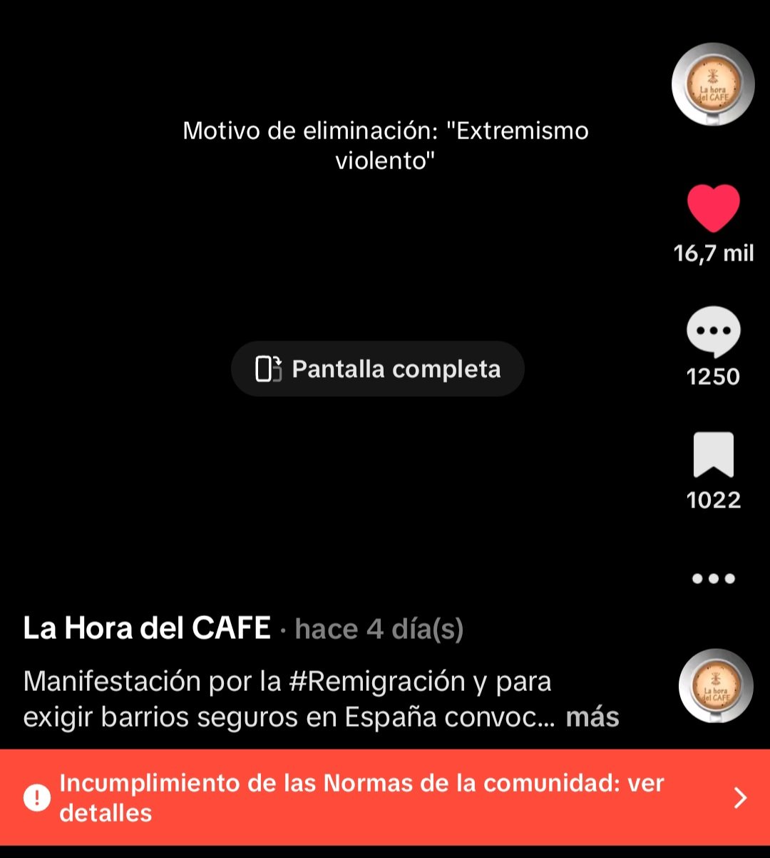 Tik Tok elimina el video de Falange cuando tenía ya más de 255.000 visualizaciones y más de 16.700 Me gusta y subiendo.